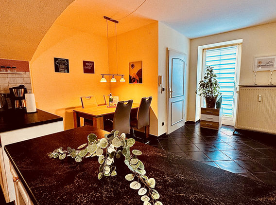 Ferienwohnung, 59 qm, Erdgeschoss, 1-4 (max. 5) Person(en), mit angrenzender Terrasse (sichtgeschützt), 1 Schlafzimmer, 1 großes Wohnzimmer mit ausziehbarem Sofa, kostenloses WLAN und Parkplatz am Haus (Mindestaufenthalt 4 Nächte)